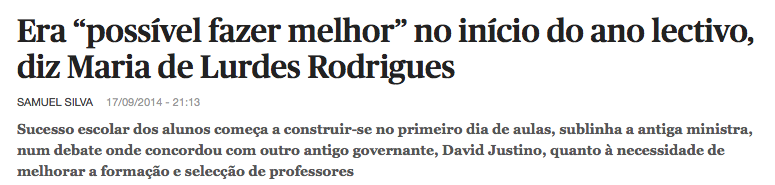 Dois dos responsáveis pelo estado a que isto chegou, os sociólogos David Justino e Maria de Lurdes Rodrigues, aparecem hoje com argumentação tão contraditória que apenas podemos lamentar que o sistema escolar tenha estado à mercê de tanta "obra feita". A ex-ministra parece mesmo num pico qualquer.