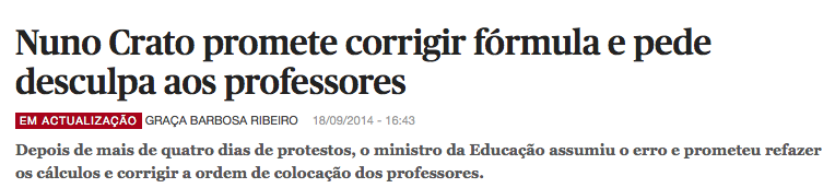 É assim há cerca de uma década: o MEC erra por impreparação e preconceitos ministeriais, prejudica, mas prejudica mesmo e seriamente, a vida de milhares de professores e raramente reconhece o erro. E o que mais cansa, é que os professores têm de aturar quem os classifica como agitadores comandados pelos sindicatos. Nuno Crato, depois de mais uns números de ilusionismo, pede desculpa aos professores e diz que vai reparar os erros.