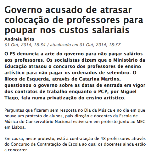 O "MEC é acusado de atrasar as colocações dos professores do ensino artístico para não lhes pagar o mês de Setembro".