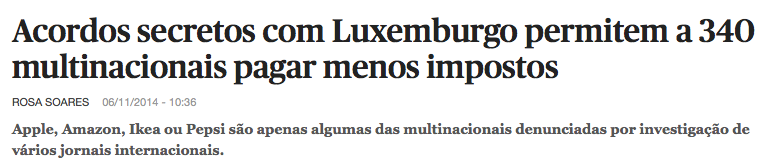 Jean-Claude Juncker (tem nome de esquentador de marca alemã, mas é luxemburguês e é o novo presidente da Comissão Europeia (CE)), parece estar envolvido no esquema seguinte: "(...)acordos secretos com Luxemburgo permitem a 340 multinacionais pagarem menos impostos(...)".