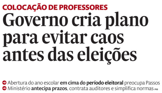A principal notícia da primeira página do semanário mais lido do país é aterradora para a imagem da escola pública: "colocação de professores: governo cria plano para evitar caos antes das eleições". É tal a incompetência de quem governa o MEC (estão há dois anos em exercício demissionário e isso permite todas as humilhações "como as de Passos nesta semana"), que o Governo contratou auditores externos e diz que anda a simplificar procedimentos. Ou seja: fazer de conta, no regime de vale tudo, para os eleitores permite gastos que o quotidiano da vida das escolas proíbe. Bater mais fundo é difícil, realmente.
