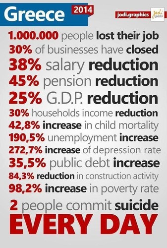 "A Alemanha não perdoou a ousadia grega e humilha-os", concordo com a frase que ouvi na TSF como também percebo o que Tsipras afirmou há dias: "Quem tiver uma solução alternativa que avance e diga qual é". Sabemos que os tempos são de vórtice informativo e que quem não for rápido não existe, mas tenho lido muita conclusão sobre um caso grego que ainda mal saiu do adro. É bom que alguma prosápia portuguesa seja contida, uma vez que não revelamos à superfície indicadores como os da "Grécia 2014", na imagem, porque o líder governativo Victor Gaspar só durou dois anos, porque a cena "do irrevogável" fragilizou o ímpeto além da troika e porque existe o "incómodo" Tribunal Constitucional.