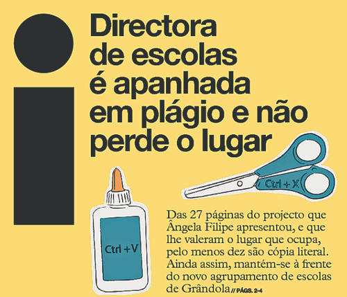 A pincipal notícia da primeira página do I é o que vê na imagem e o Ionline desenvolve o tema: "Grândola. Professora venceu um concurso com projecto plagiado".