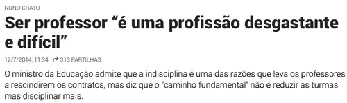 Lembrei-me da entrevista, na imagem, ao ex-MEC (12 de Julho de 2014) publicada no Observador. Andava-se à volta do elevado número de professores, uns 4 mil, que solicitaram a rescisão contratual; com um programa favorável a "fuga" atingiria uns 30 a 40 mil.
