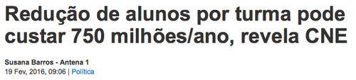 "Redução de alunos por turma pode custar 750 milhões por ano", disse o presidente do CNE, em Santarém, nas jornadas do PSD, o seu partido. David Justino fez umas contas que nenhum especialista deste planeta consegue fazer, nem sequer por aproximação. Mas faz e lança-as como se fossem umas "bocas". É triste. O "contabilista" é presidente do CNE, ao que consta não é marciano, e nunca lhe ouvimos uma linha sobre a percentagem do PIB para a Educação, por exemplo, que já nos envergonha há uns anos.