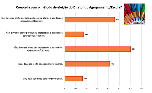 O blogue ComRegras publica os resultados de uma sondagem "concorda com o método de eleição do Diretor do Agrupamento/Escola?". O método actual é rejeitado pela maioria dos inquiridos. Obtém a última posição como se observa na imagem. Tem aqui a ligação ao post com uma análise do Paulo Guinote.
