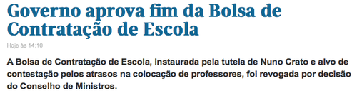 O DN informa que o "Conselho de Ministros revogou a bolsa de contratação de escola". Eram os concursos mais incompetentes da Europa (não há sequer desmiolo parecido), exigiam que milhares de candidatos sofressem com editais inenarráveis e fica para a história, como um exemplo entre milhares, o professor colocado em mais de cem escolas no mesmo concurso. Com os meios informáticos existentes, é possível criar um concurso nacional decente que mantenha a reserva de recrutamento por lista graduada durante todo o ano lectivo.