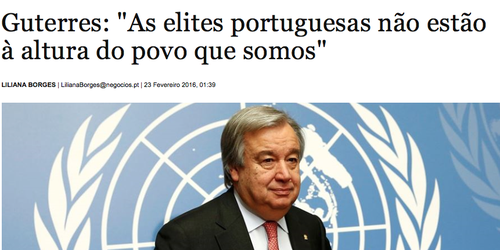 "As elites portuguesas não estão à altura do povo que somos", disse ontem Guterres (secundado por Barroso), segundo o Jornal de Negócios, no horário nobre da RTP1. Era bom sabermos se as "elites" desataram a ligar para a direcção de informação iradas com Guterres e com quem convida radicais. É que as "elites" cansam-se depressa com o investimento em Educação (e Guterres conhece bem esse pântano e parece que também sublinhou essa prioridade) e tratam de repor de imediato critérios de "eficiência" - fazer "mais-com-menos" - e não suportam incompreensões por facilitismo.