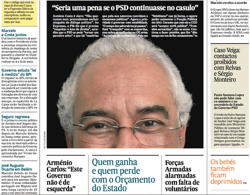 O Expresso está sem fotógrafos ou deseja o afogamento do actual Governo. A foto de Costa, na 1ª página, pode ter duas leituras como a história do copo. Como a CS impressa está em crise, vou pela 1ª hipótese em beneficio do Grupo Impresa que consegue mais uma 1ª página de antologia; toda ela.