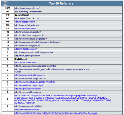 Que me recorde, é a primeira vez que os visitantes vindos do facebook ocupam o primeiro lugar nas audiências do blogue. Nos registos de ontem, e que se vêem na imagem, a origem nessa rede social superou mesmo os visitantes que entram no blogue como "self referring/bookmarker" ou através do google (que registaram os números habituais). O fenómeno tem uma explicação: os posts sobre os colégios "privados" suscitam muito interesse.