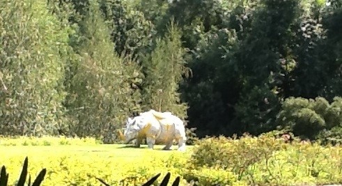 Fotografei este rinoceronte (uma bela escultura) em Agosto de 2013 nos jardins da Gulbenkian. Tem uns amarelos que não se vêem bem (o corno, uma sela de "cavalo" no dorso e outros detalhes). Já se sabe: o rinoceronte tem uma reduzida visão periférica e quando aponta é difícil corrigir a trajectória; nem sequer vai a tempo de emendar um erro. Neste caso, está parado, "enjaulado" numa selva urbana e pronto a ser cavalgado. Que destino, realmente.
