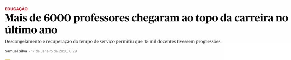 Uma das notícias do dia é a "chegada óbvia de 6.000 professores ao escalão mais elevado da carreira" que esteve vazio durante mais de uma década. Ou seja, estes professores chegaram com anos de atraso ao 10º escalão, e sem retroactivos, e esses cortes, sem a recuperação total do tempo de serviço, originaram que uns 60.000 nunca o atinjam.